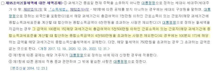 월세금액에 대한 세액 공제 법안은 아래와 같으며, 위에 언급한 내용은 모두 조세특례제한법에 근거합니다. 따라서 법적으로 월세 일부 환급이 보장된다고 볼 수 있습니다.