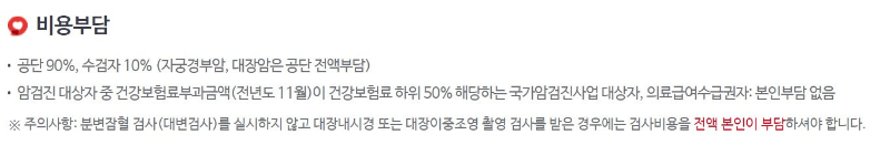 암 검진에는 위암, 유방암, 대장암, 간암, 자궁경부암, 폐암 검진이 있으며, 연령에 따라 검사항목이 달라집니다. 자궁경부암과 대장암을 제외하고 본인부담금 10%가 있을 수 있습니다. 연령별로 암 검진 항목이 달라지니 아래 표를 참고하세요.