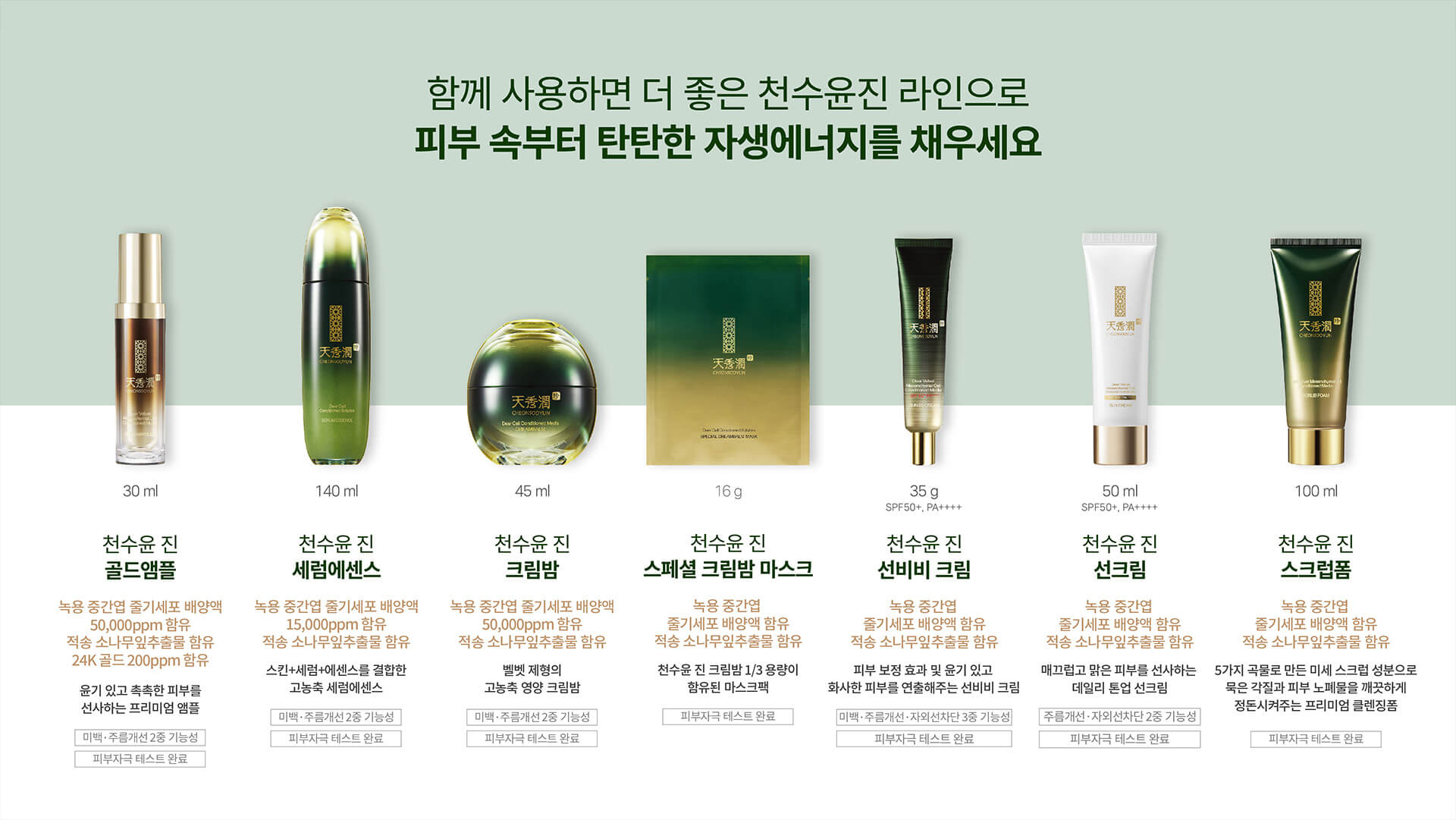 천수윤진이 선보이는 프리미엄 안티에이징 브랜드는 지친 피부를 위한 집중 케어 아이템 4종입니다. 여름철 강한 자외선으로 손상된 피부를 건강하게 지켜줄 필수 아이템입니다. 첫 번째 제품인 세럼 에센스는 녹줄기세포 배양액 15,000ppm이 함유된 고농축 영양세럼으로 미백 및 주름개선 이중기능 인증을 받았습니다. 토너, 세럼, 에센스가 혼합된 제형으로 세안 후 첫 단계에서 사용할 수 있습니다.