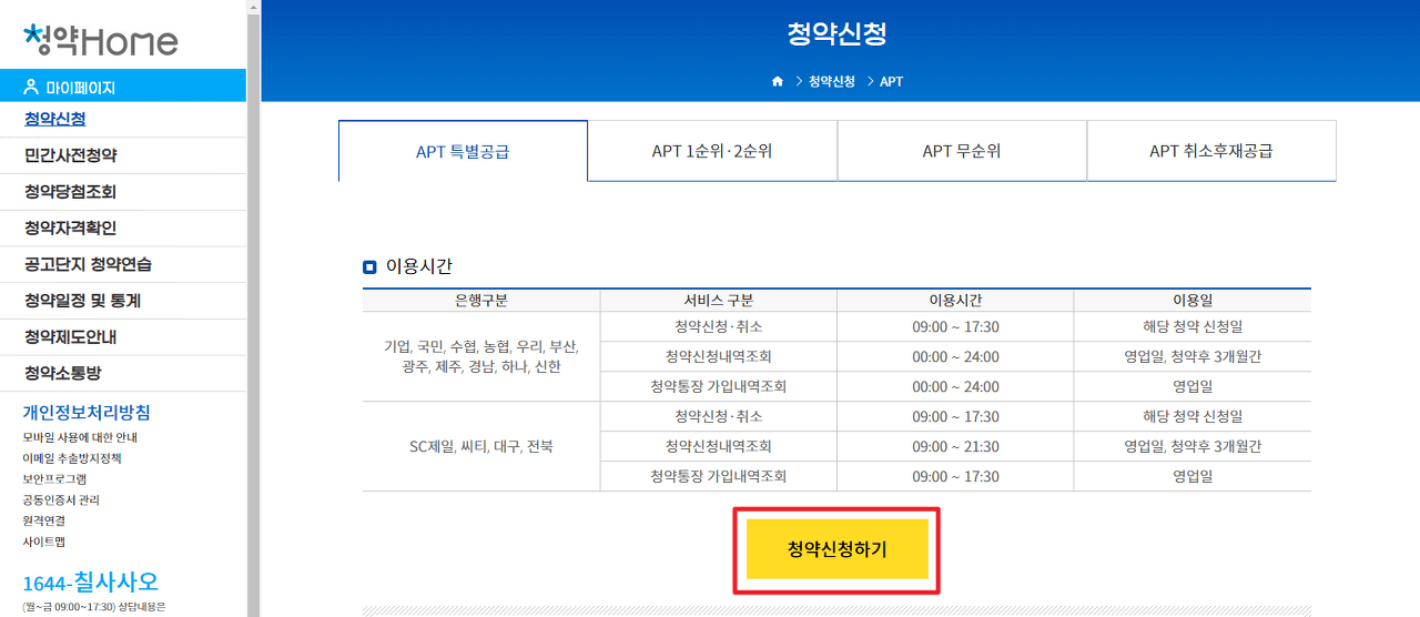 해당하는 탭을 선택한 후 청약 신청 버튼을 클릭하여 청약을 간편하게 신청할 수 있습니다. 화면이 바뀌면 여러 가지 메뉴들이 보입니다. 이용 시간, 청약 신청 및 조회 등의 기능을 이용하실 수 있습니다.
