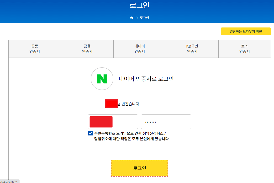 네이버 인증서로 로그인을 시도했지만, 청약을 신청하지 않아 로그인에 실패했습니다. 하지만, 청약 신청을 원하시는 분들은 주민등록번호를 잘못 입력하면 문제가 발생할 수 있으므로, 반드시 여러 번 확인 후 청약 신청을 하시기 바랍니다.