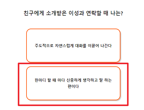 2번째 문항입니다.소개받은사람과 서로 알아가는 단계에서 고민이생겼다면 나는 친구들이나 지인에게 상담을 한후 혼자서 충분히 생각을 해보고 나서 결정을 할것이기 때문에 위에 문항을 선택했습니다.