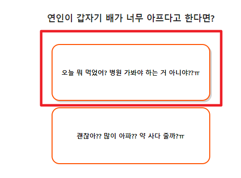 연인이 배가너무 아프다고하면 병원가봐야 하는거 아닌가 생각이 들어서 윗문항을 선택했습니다.