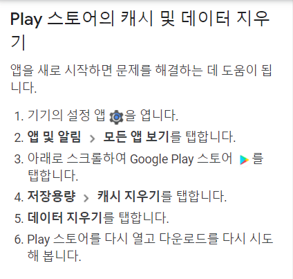 모바일 장치의 Play Store에서 캐시와 데이터를 삭제합니다. 설정을 열고 '앱 및 알림'을 선택한 다음, 모든 앱의 목록을 보여주는 화면에서 Google Play Store를 선택합니다. 여기서 저장 공간을 확인하면 캐시 삭제와 데이터 삭제가 있습니다. 먼저 데이터 삭제를 수행한 다음, Play Store를 다시 시작하고 앱을 다운로드합니다.