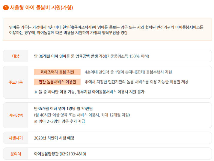 서울시는 다음 달부터 '서울형 아이돌봄비' 지원 사업을 본격적으로 시행합니다. 이는 전국 최초로 가족 돌봄과 민간 돌봄 서비스를 함께 제공하는 '엄마 아빠 행복 프로젝트'의 대표적인 사업입니다.