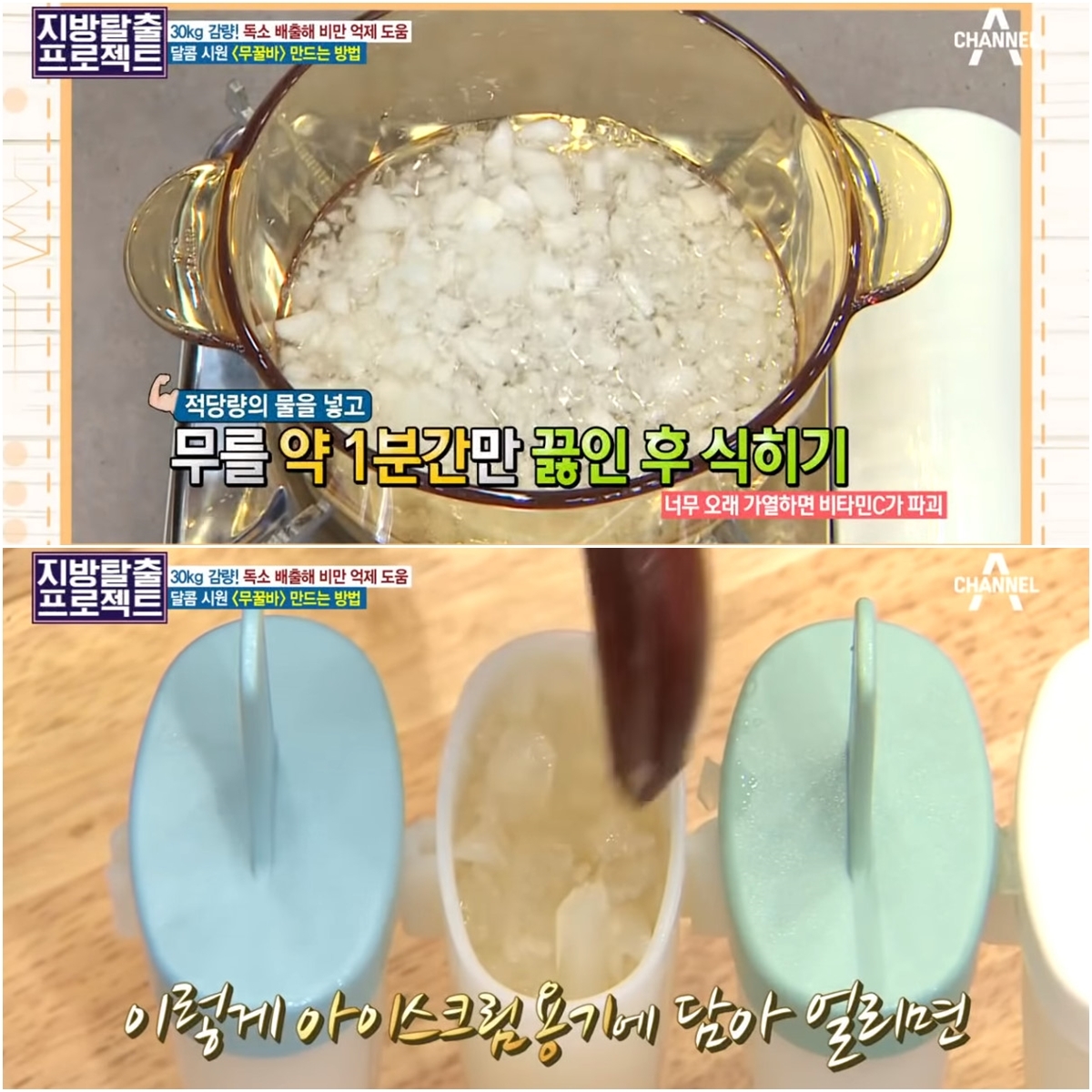 먼저 볶음밥 할 때 크기 정도로 자른 무를 한 컵 반과 꿀 2큰술을 준비한다. 그다음 반국자 정도의 물과 무를 냄비에 넣어 약 1분간 끓인 후 식힌다. 식힌 무는 꿀과 함께 섞은 다음 아이스크림 용기에 담아 얼리면 달콤 시원한 무꿀바가 완성 된다.