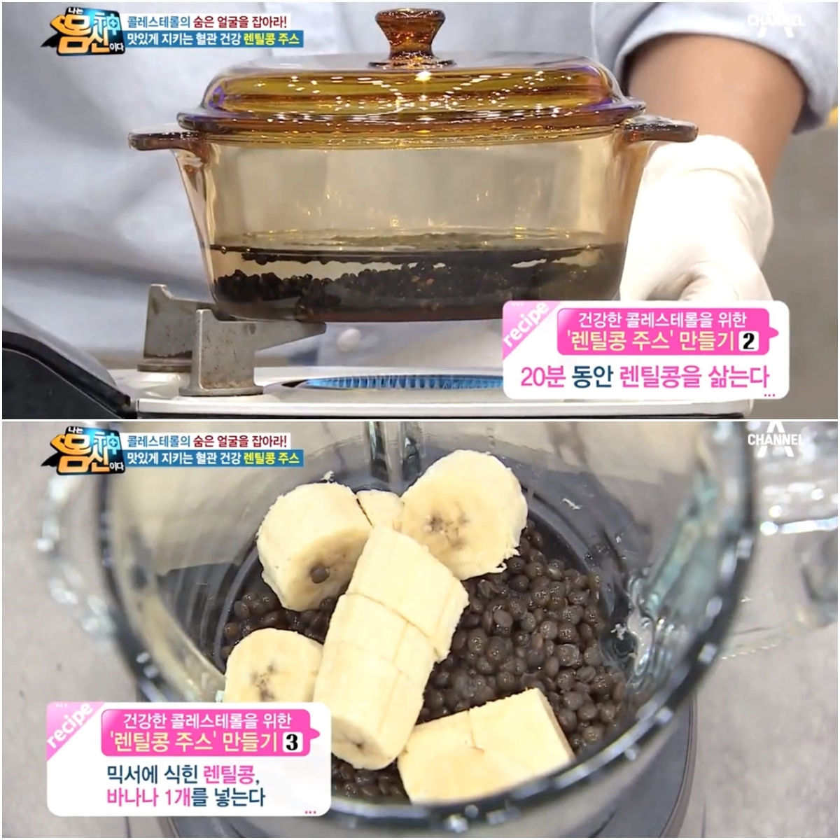냄비에 렌틸콩 100g을 물과 함께 부어준다. 그다음 20분 동안 렌틸콩을 삶는다. 20분간 삶은 렌틸콩은 한 김 식힌다. 믹서에 식힌 렌틸콩, 바나나 1개를 넣는다. 두유의 양은 300~400ml를 기준으로 기호에 따라 양을 조절한다. 마지막 두유까지 넣었다면 곱게 갈아주면 완성이다.