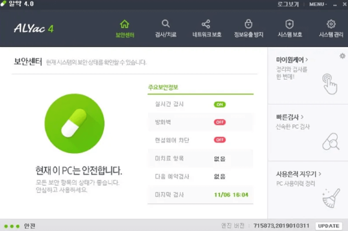 알약은 ESTSOFT에서 개발한 PC와 스마트폰을 위한 백신 프로그램입니다. V3 Lite와 함께 국내에서 가장 많이 쓰이는 백신 프로그램입니다. 실시간 감시 기능을 포함하여 랜섬웨어 차단, PC 최적화 등의 부가적인 기능도 제공합니다.